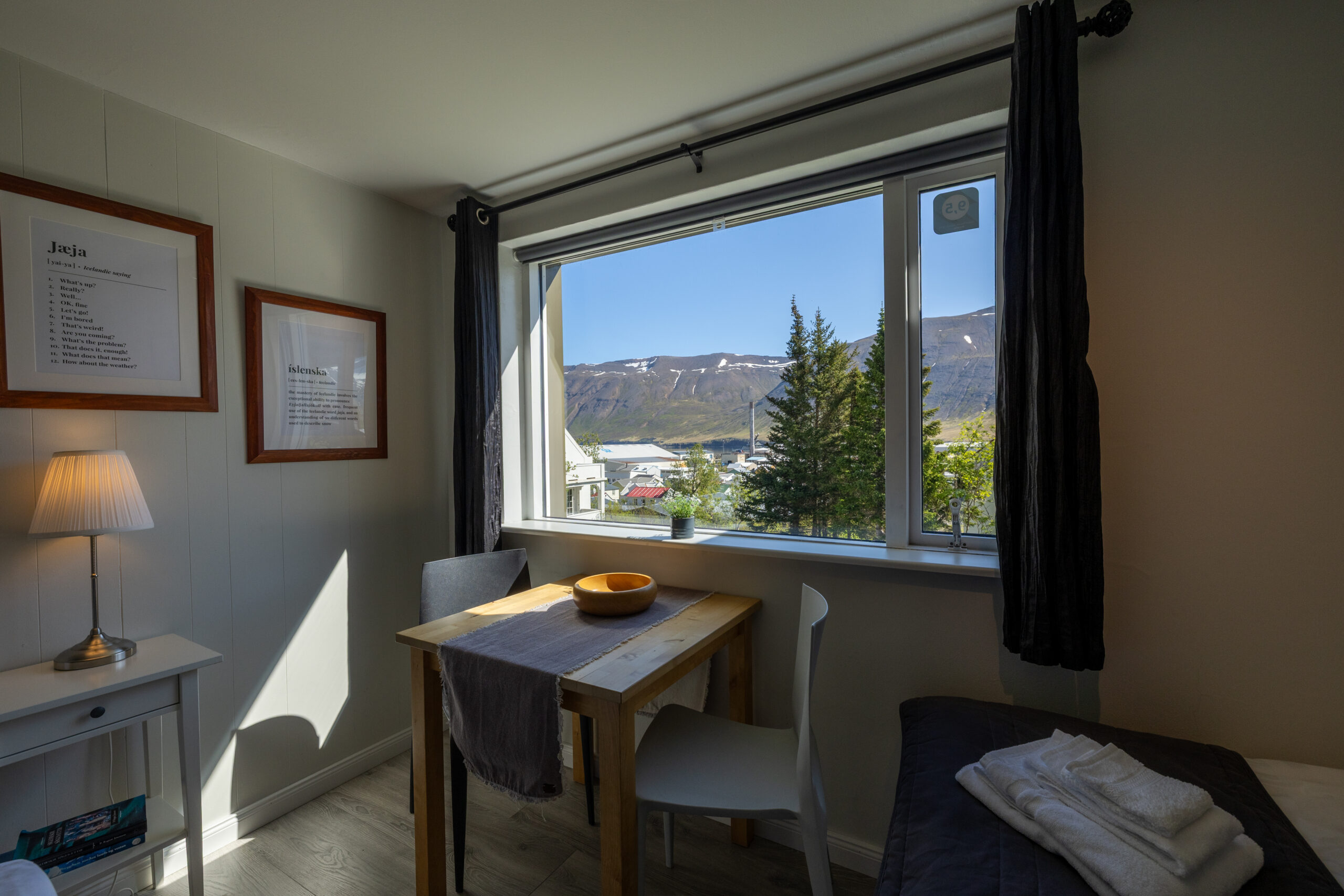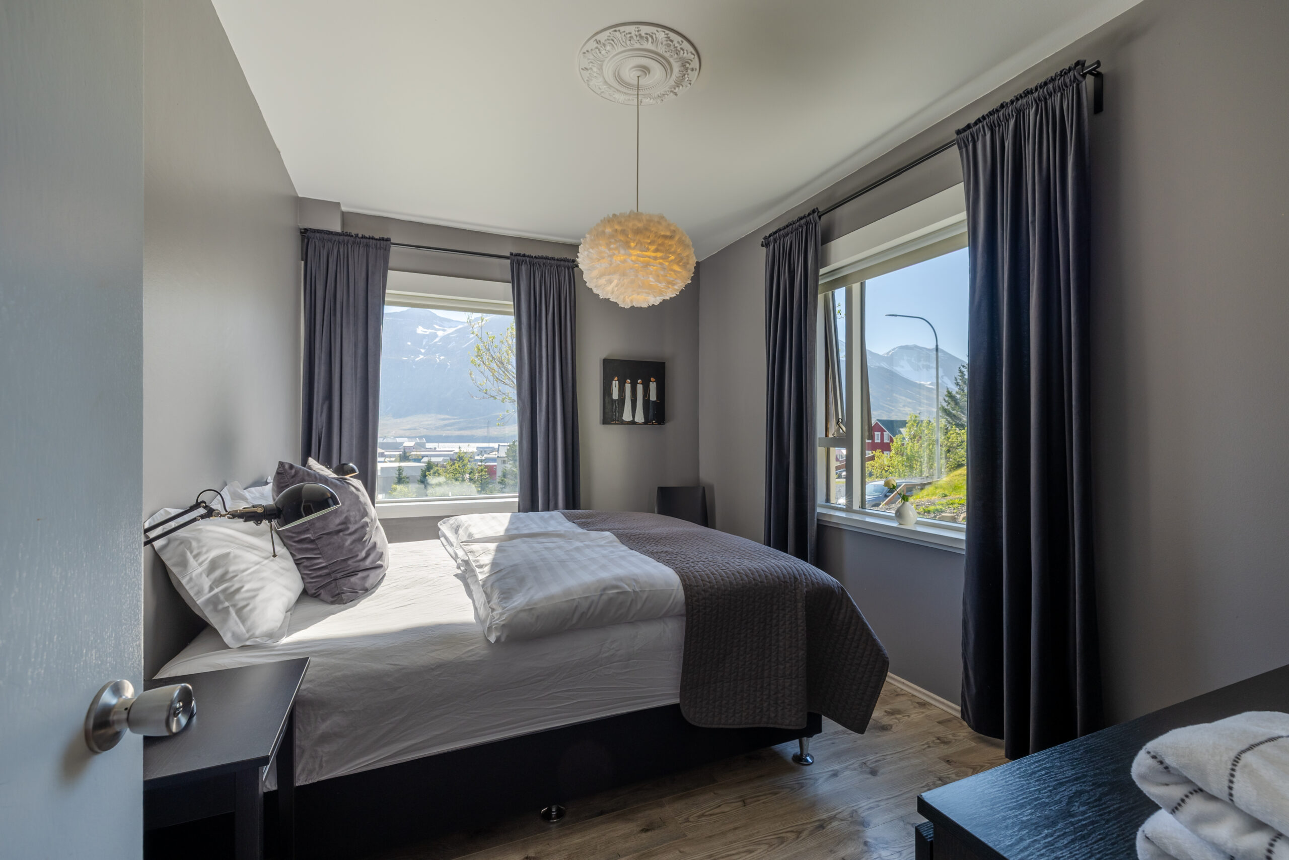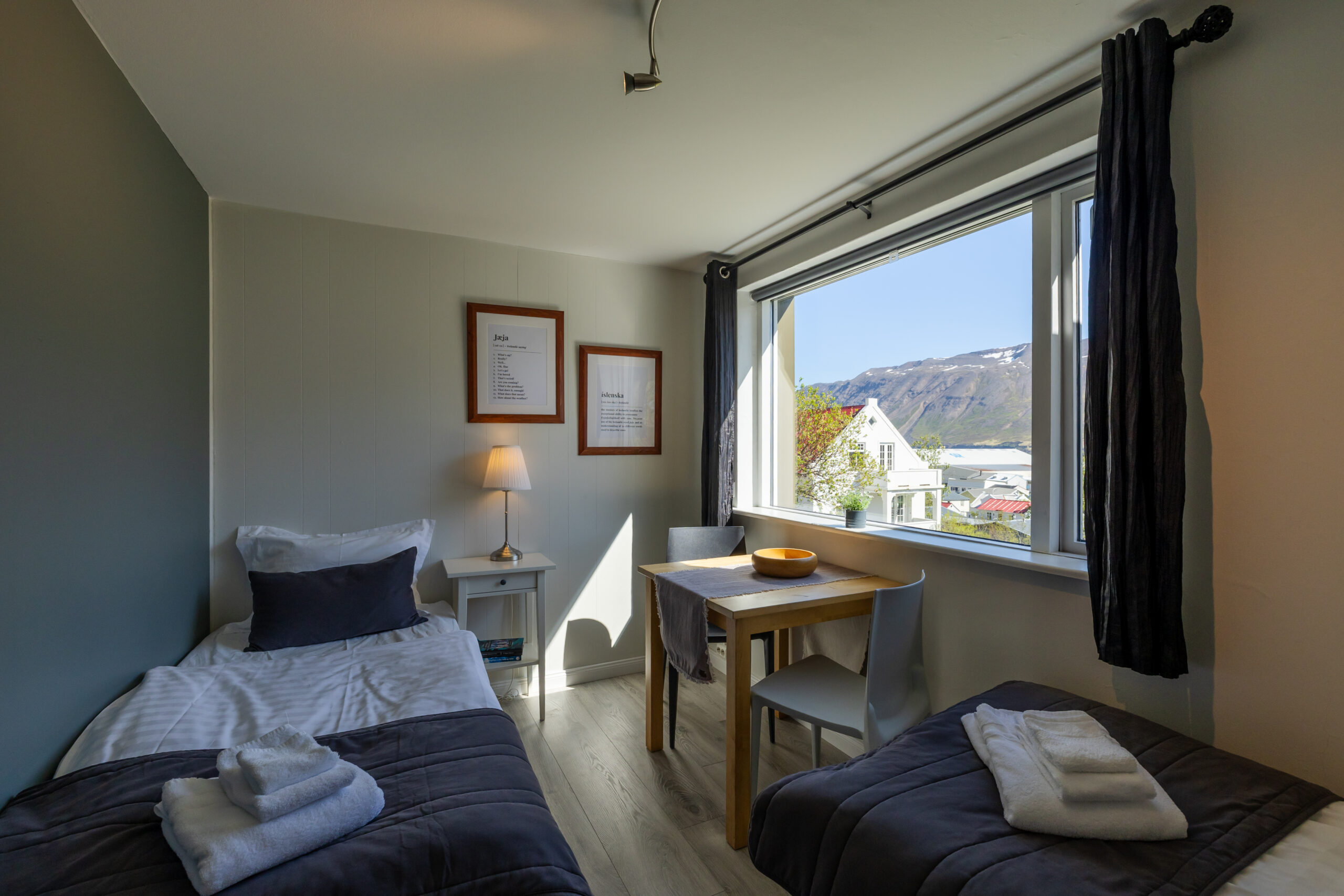 Hlýleg og björt herbergi með útsýni yfir bæinn og kirkjuna eða garðinn. Fullkomin fyrir vini eða ferðafélaga (1–2 einstaklinga). Hvert herbergi er með tveimur þægilegum einbreiðum rúmum, mjúkri lýsingu og hlýlegum smáatriðum sem gera dvölina afslappaða og notalega. Sameiginlegt baðherbergi er frammi á gangi. Frábært val fyrir þá sem leita að þægindum, sveigjanleika og fallegum dvalarstað í hjarta Siglufjarðar.