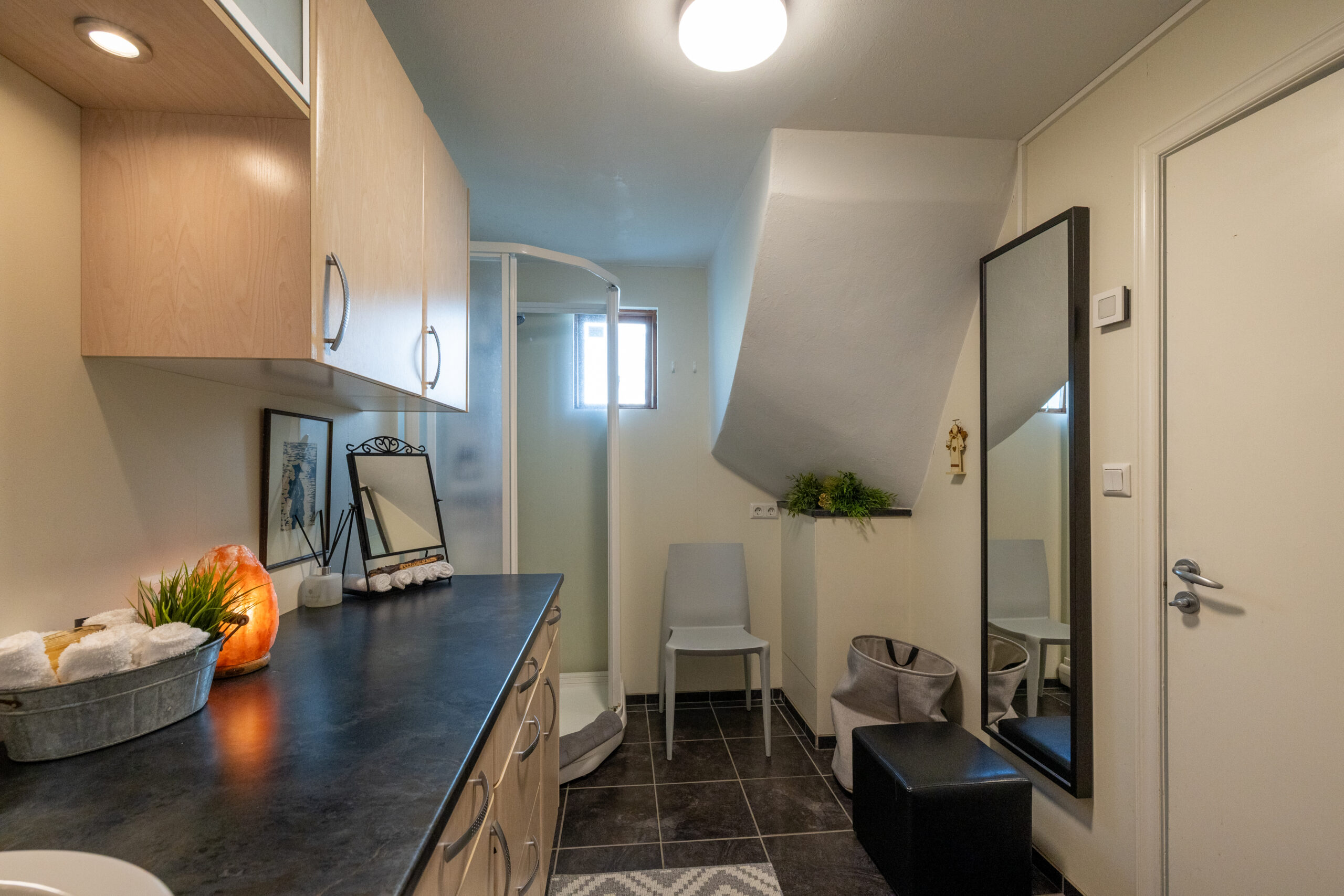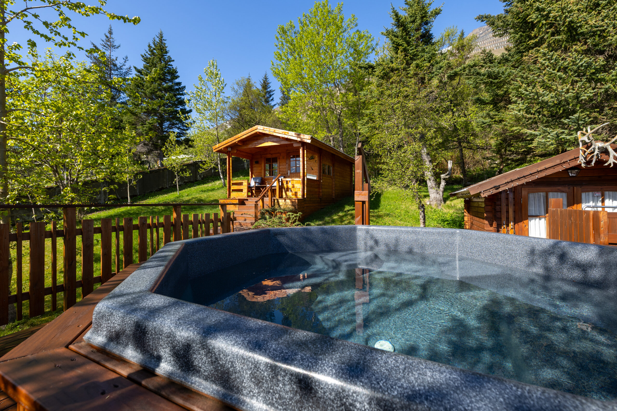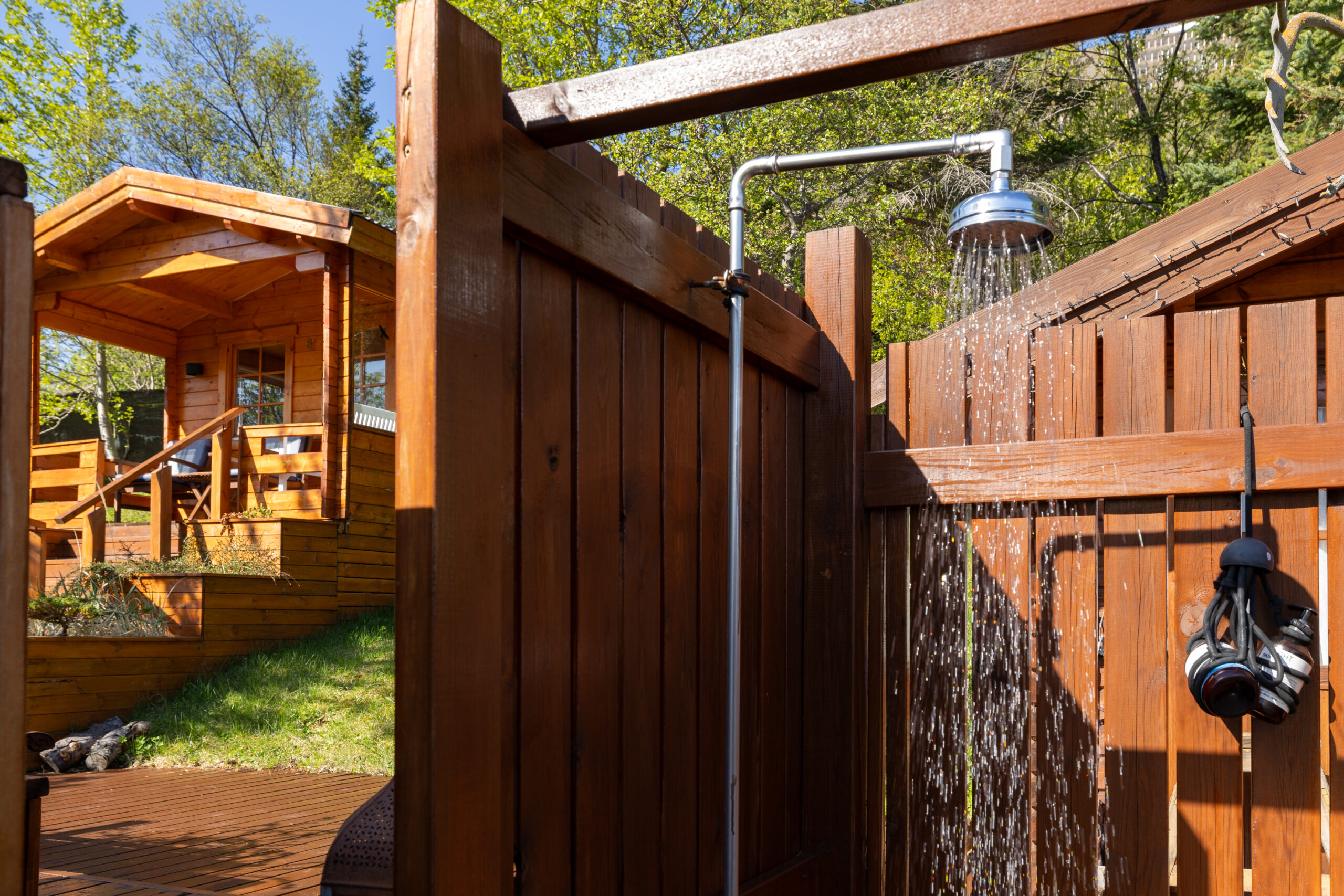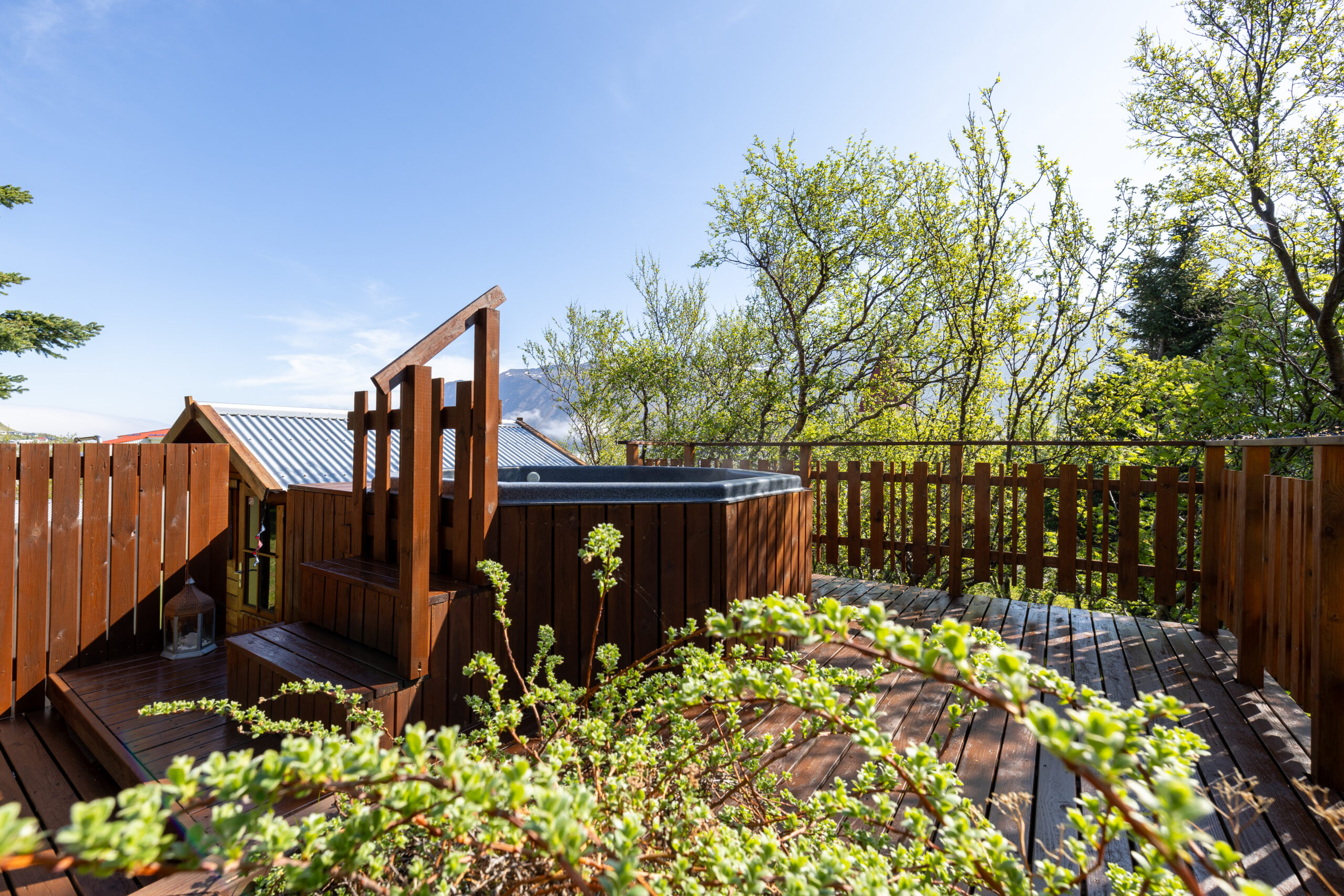 Gestahús með eldhúskrók, útisturtu og heitum potti