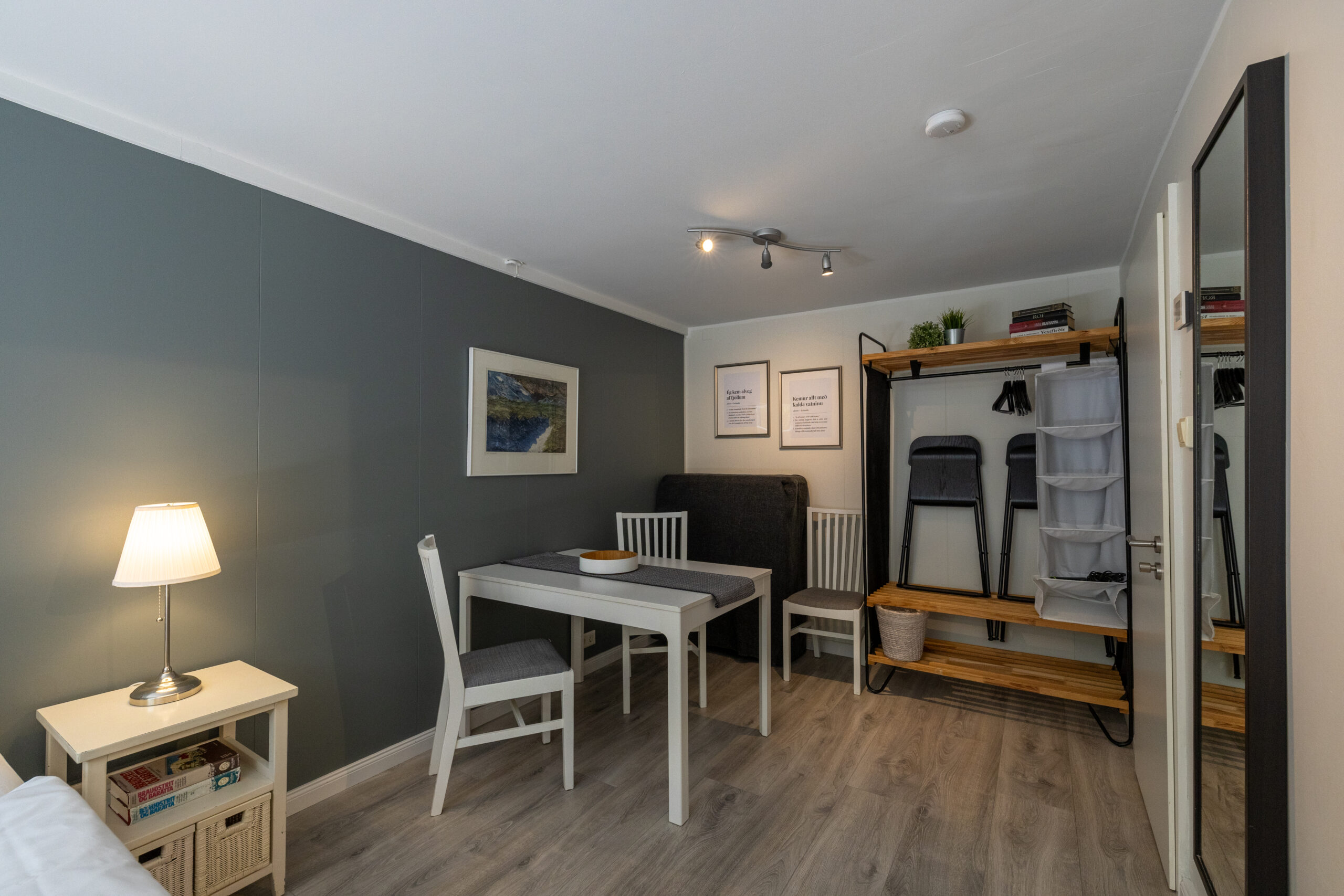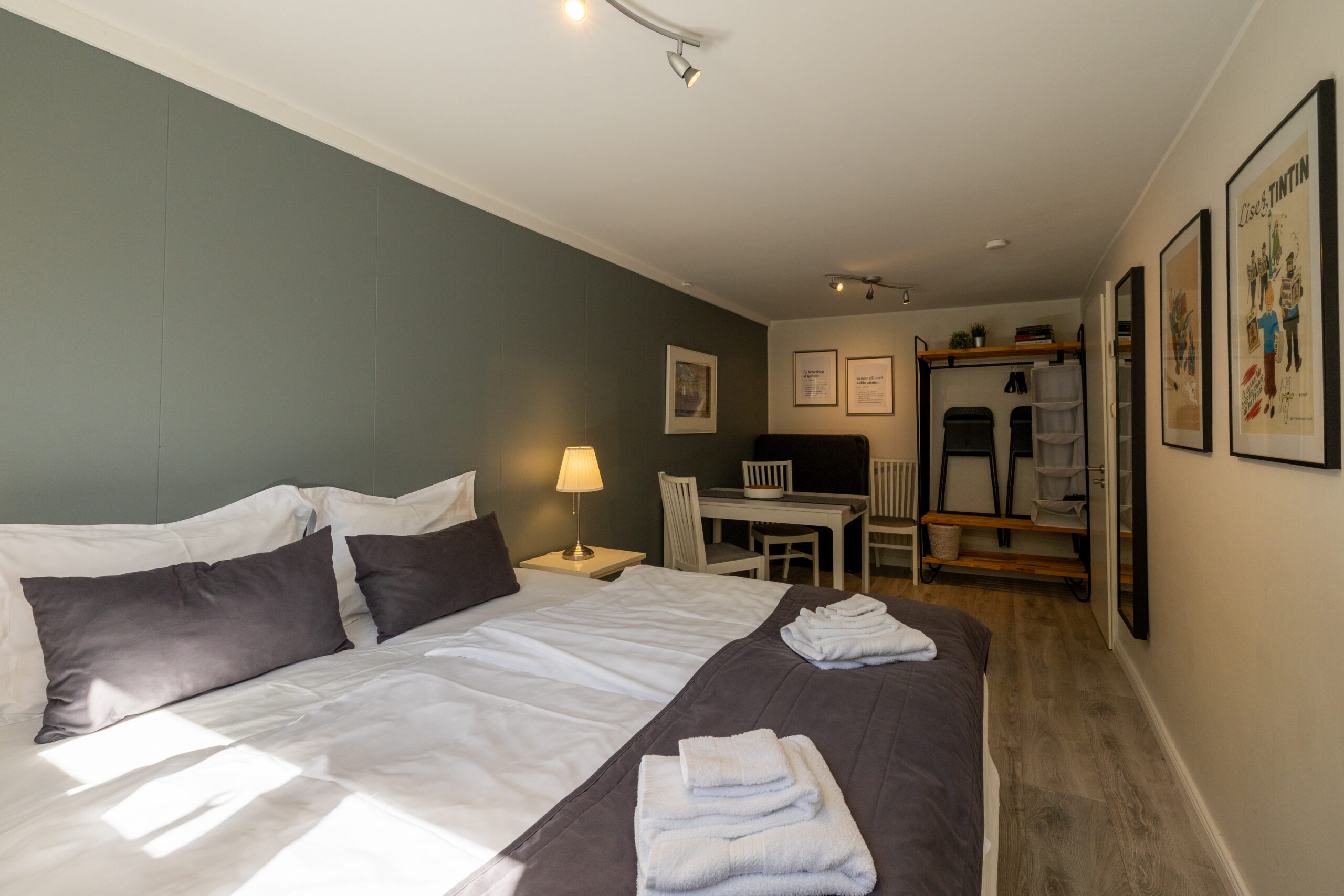 Rúmgott og þægilegt herbergi fyrir 1–3 einstaklinga, tilvalið fyrir pör, vini eða litlar fjölskyldur. Herbergið er með einu hjónarúmi og þægilegu aukarúmi, auk borðs og þremur þægilegum stólum – fullkomið fyrir rólega stund eða til að skipuleggja næsta ævintýri. Mjúk lýsing og hlýlegt andrúmsloft gera herbergið að góðum stað til að slaka á. Sameiginlegt baðherbergi er staðsett frammi á gangi.